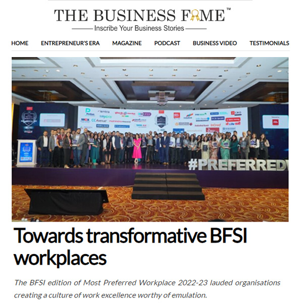 In continuation to our flagship event - Most Preferred Workplace Series, we now turn the spotlight specifically on the BFSI sector with our upcoming recognition initiative Most Preferred Workplace 2022-23 BFSI Edition. In this exclusive industry platform, we will laud leading brands from banking, financial services and insurance sector that have particularly succeeded in their holistic reorientation of the business landscape, which has seen them create an employee experience that is meaningful, collaborative, and inspiring.